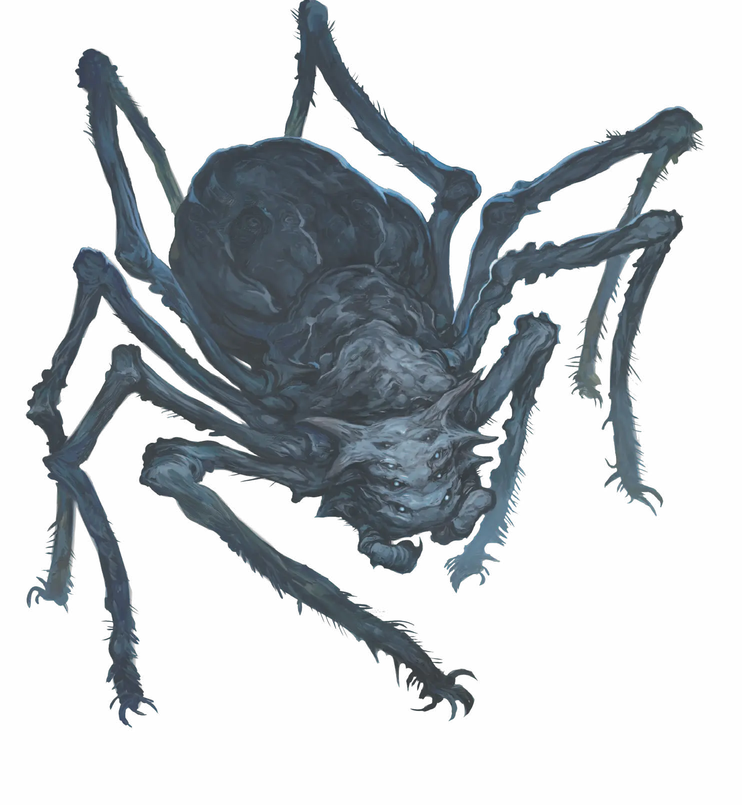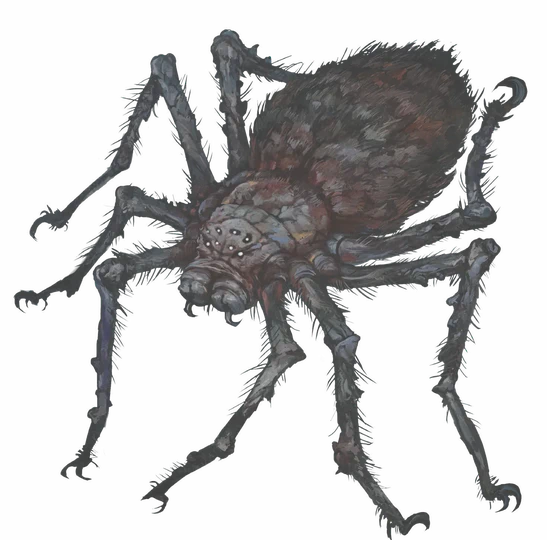 The Great Spiders that plague Mirkwood are the offspring of Shelob, last daughter of Ungoliant. While not as powerful as Shelob, they are still large and terrible creatures, with keen senses, darting at their prey and intelligent enough to converse and share wicked plans.The Great Spiders use their webs to trap their prey and dangle their victims from tree branches after stunning them with poison.