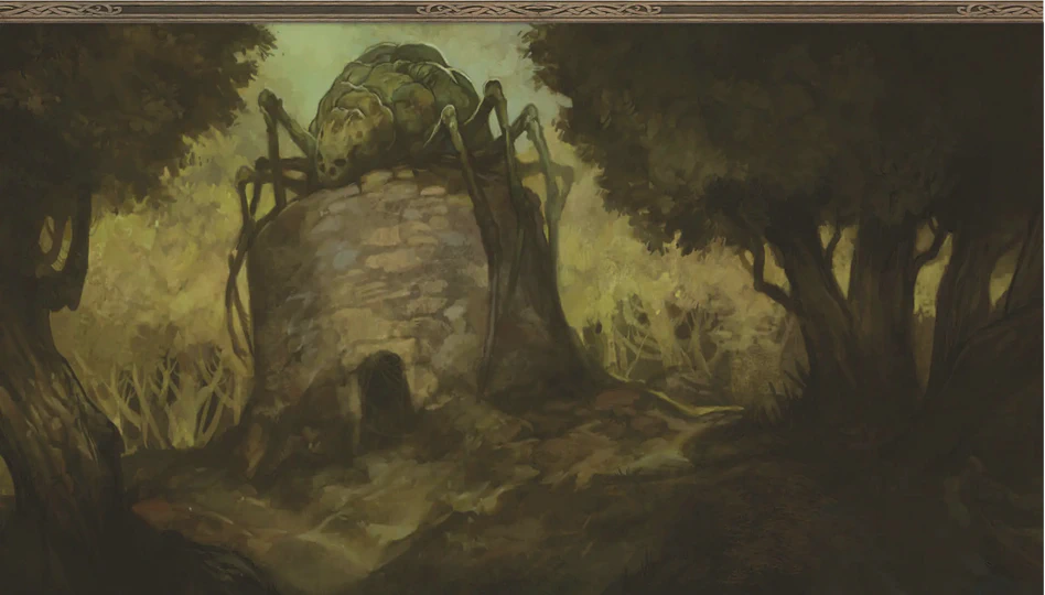 The Great Forest Spiders have made a lair in the proximity of Dol Guldur. They are the offspring of Shelob but have adapted to the forest environment over several generations. The Great Forest Spiders are not as powerful as Shelob, but they are still large and terrible creatures. They live on networks of webs which they wove among the trees. The Great Spiders also use their webs to trap their prey and dangle their victims from tree branches after stunning them with poison.