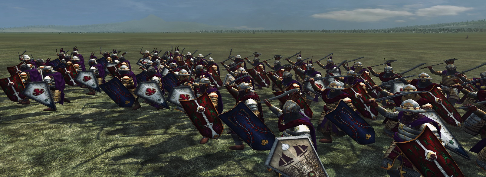 | Vinefleet Mariners | The realm of the Vintner-Court is fundamentally one of of traders and merchants, of businessmen and shrewd hagglers. Wealth is the measure of a man, and a well-stocked treasury can buy almost anything in Dorwinions coastal cities and towns. The Sea of Rhun is the place whence this coveted wealth flows from - or rather from the red-sailed ships of the Vinefleet. Initially, the fleet was called such due to its nature - its holds were overwhelmingly filled with the produce of the vintner barons and their large vineyards. Today the fleet sails around the coast of the sea of Rhun, stopping in Neburkha, then all the way to Esgaroth, from where huge caravans of merchants set out to the woodland realm, or to yet more distant destinations. But to keep this fleet secure, and to safeguard against the predations of pirates, corsairs and other such maritime filth - and to protect the many harbors of the dorwinionite coast - there need to be men skilled in a different trade than their merchant employers. The Mariners are those men. All other men under arms in the realm, bear those same arms only temporarily. The Thornguard when duty calls, the nobles when the the fancy takes them. The Mariners practice all year round, live on their ships, and are of cut-throat nature that few can rival. Anyone may join, be he commoner, Eastron exile, or noble son - as long as they can complete the rigorous trials successfully - but whoever joins, does so for life. The merchant guilds pay these men handsomely - in addition to the loot they “liberate” from the holds of vanquished pirates, and it shows. “Mariner” is a byword for flamboyance and gaudy behavior, with their elaborately crested helmets, heavily decorated shields and expensively colored cloth. In battle, these men show no mercy, any doubts as to their effectiveness, any hope of the enemy that these peacocks are merely overdressed and effeminate nobles viciously cut and broken apart by the devastating barrage of lead-weighted javelins and the subsequent strikes of brutal boarding axes. | ![]() |