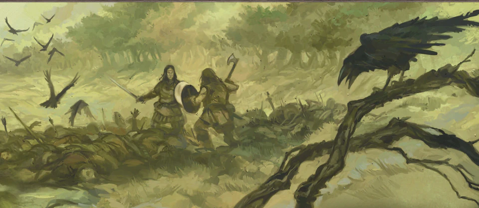 Their equipment is well made and sturdy, most wear leather and padded armor, with some wealthier or more experienced warriors clad in chainmail. All bear vicious, iron-headed axes, weapons capable of crushing shields and splitting helms, and wear stout iron helmets for protection. The torcs adorning their necks, bestowed by the council, mark their honor and achievements.