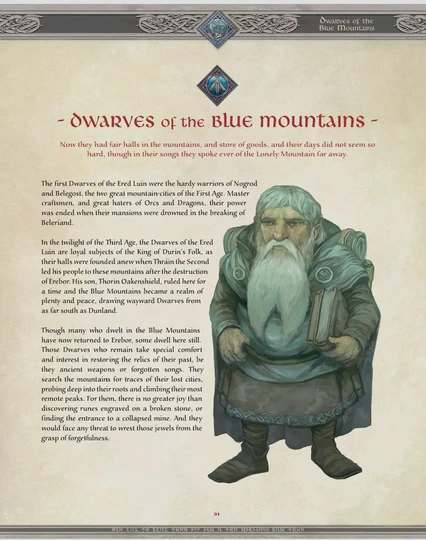 For many years, Ered Luin has not had to deal with full scale warfare; at most they have had to defend against troublesome bands of orcs. Now that Middle-earth moves to a great war, the dwarves of Ered Luin have taken up the crossbow, as it requires minimal training and thus can be used effectively even by those inexperienced in warfare. Sharp iron bolts, forged with a mastery in metalworking possessed only by the Dwarves, are fired with lethal accuracy to the enemy. Companies of Scouts from the Blue Mountains, lightly armoured and equipped with crossbows and bolts, are typically used for scouting and for weakening the enemy ranks, before the unmatched Dwarven infantry charges into battle.
