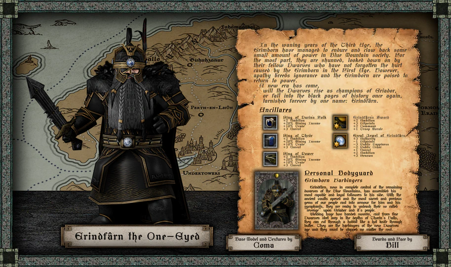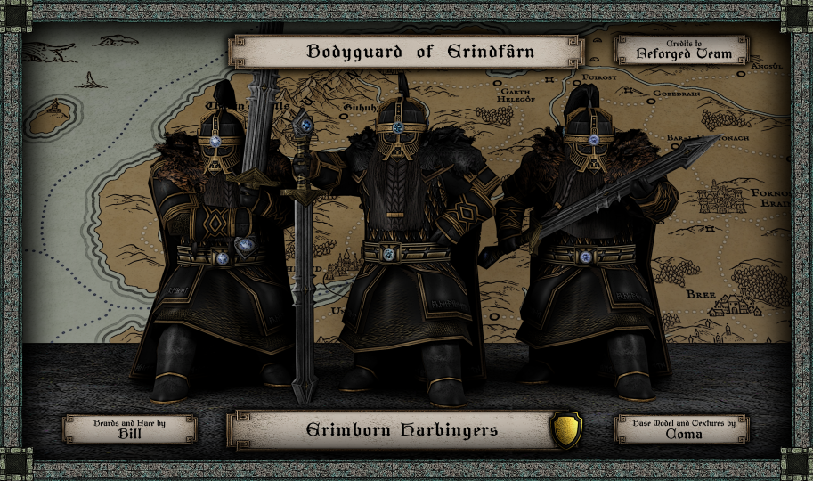 Grindfârn, now in complete control of the remaining dwarves of the Blue Mountains, has assembled his most capable and loyal followers to his side. With the ancient vaults opened and the most sacred and precious gems of our people cast into armour for him and his sycophants, they are ready to unleash their so called "revenge" upon Eriador and it's people. Wielding huge two handed swords, cast from fine Dwarven steel deep in the depths of Thorin's Halls, they can cut through a hobbit like a hot knife through butter. They are the harbingers of the new Dwarven age and they must be stopped no matter the cost.
