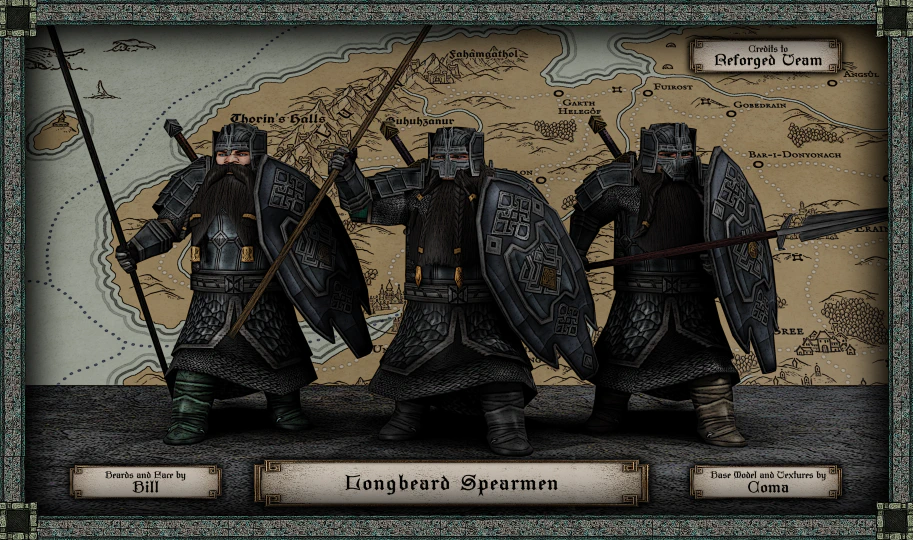 This unit consists mostly of the more experienced and elder Dwarves, who have seen many battles. They are very brave and motivated warriors, willing to fight for their lords and dedicated to protect their chief cities and mines in the Ered Luin. They are a deadly force to be reckoned with; for as with all Dwarves, they have excellent morale, ensuring that they will only retreat from battle when all hope of victory is gone. Armed with a sharp spear -a weapon both useful and deadly, especially when handled by the skilful hands of the Dwarves- and a round wooden shield of good quality, they will bring swift death to their foes. They wear finely crafted armour and form the basis of the medium tier troops from the Blue Mountains. Their blue-coloured clothes and garments clearly show from which mountain range they come and where their allegiance lies.