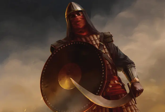 The Swords are foot troops in medium armor and wielding a curved blade. These men form a hard-hitting reserve. Once the foe has been tired and worn down by fighting the common tribesmen these true warriors descend on them and carve them into pieces.