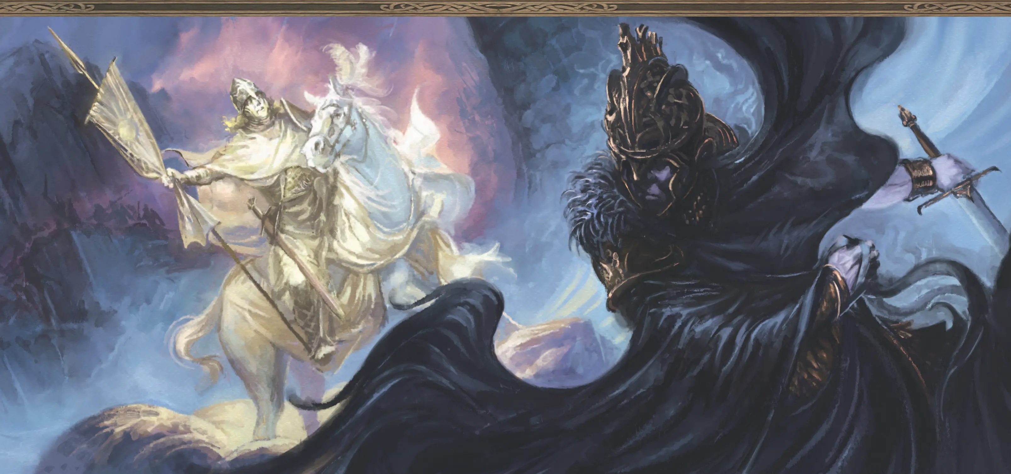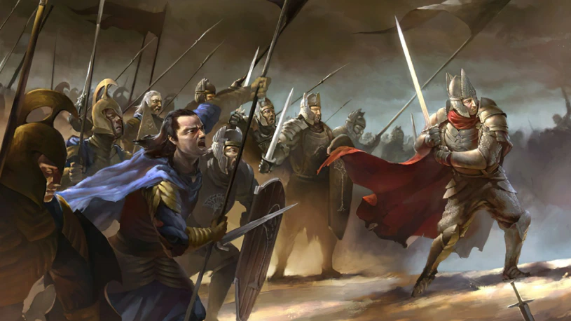 They visit upon the enemy a violence unlike any other, each thrust of their mighty lances piercing the skulls of many foes. Lit with the light of the stars at their backs, the charge they give is wrath and ruin. Beheld by the eyes of the shadow, they are a terror beyond measure. Among Men and Dwarves and Elves and Orcs, the Company of the Golden Flower knows no equal.