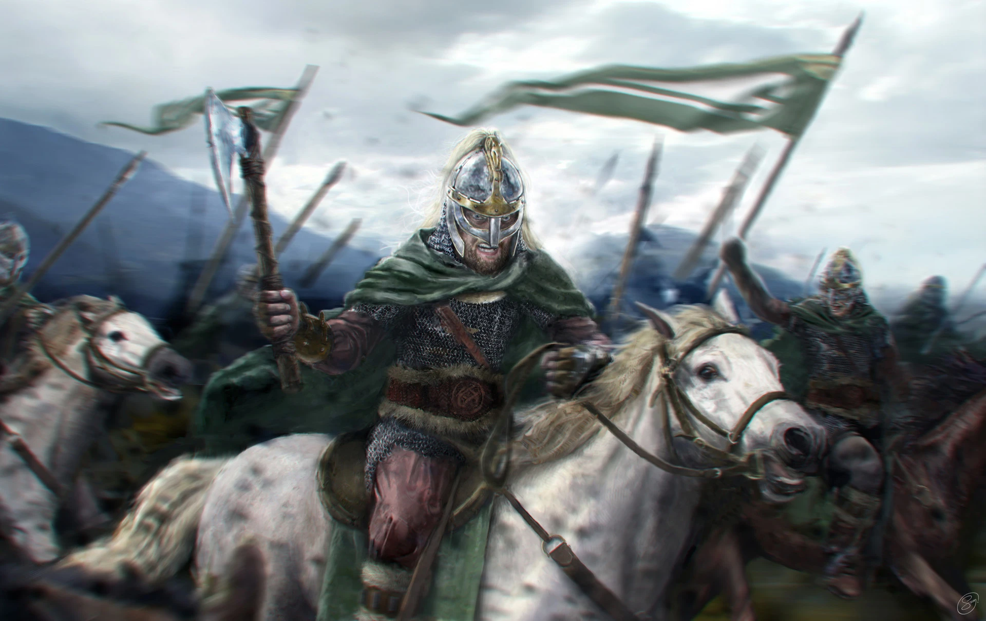 The axe is an invaluable tool to the Rohirrim in times of peace and a deadly weapon in times of war. The men that wield it are usually not professional soldiers, but that does not mean they should not be feared. The blood of the middle men burns brightly in their veins, and the servants of the Dark Lord would be folly to cross them. They also carry a shield and mail, and their axe gives them a considerable advantage over heavily armed opponents.